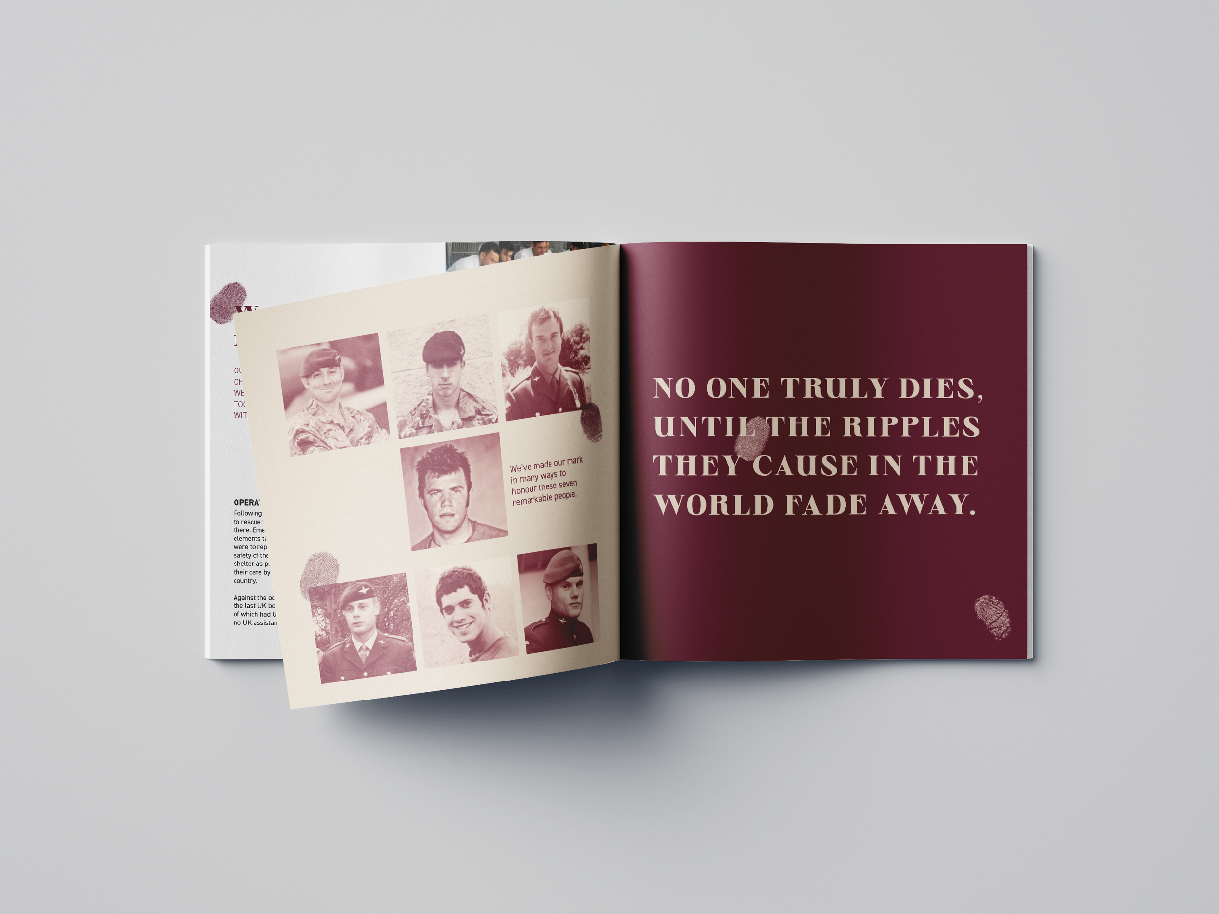 353 is a charitable trust supporting the military community and their families, founded in memory of Private Conrad Lewis. For their final fundraising ball, the charity asked us to create a theme that honoured their work and legacy. My concept was chosen: a powerful portrait of Conrad made entirely from the fingerprints of his family members. This visual metaphor symbolised both the personal loss at the heart of the charity and the enduring impact they would leave behind. The fingerprint portrait became the central motif of the event’s look and feel, tying together print, digital, and environmental design. This project highlighted the role of design in storytelling and its ability to capture deep emotion in a visual language.
